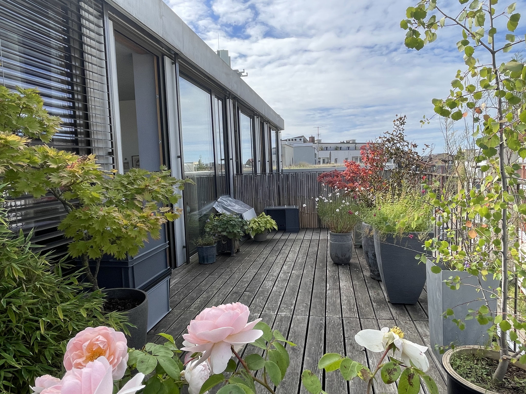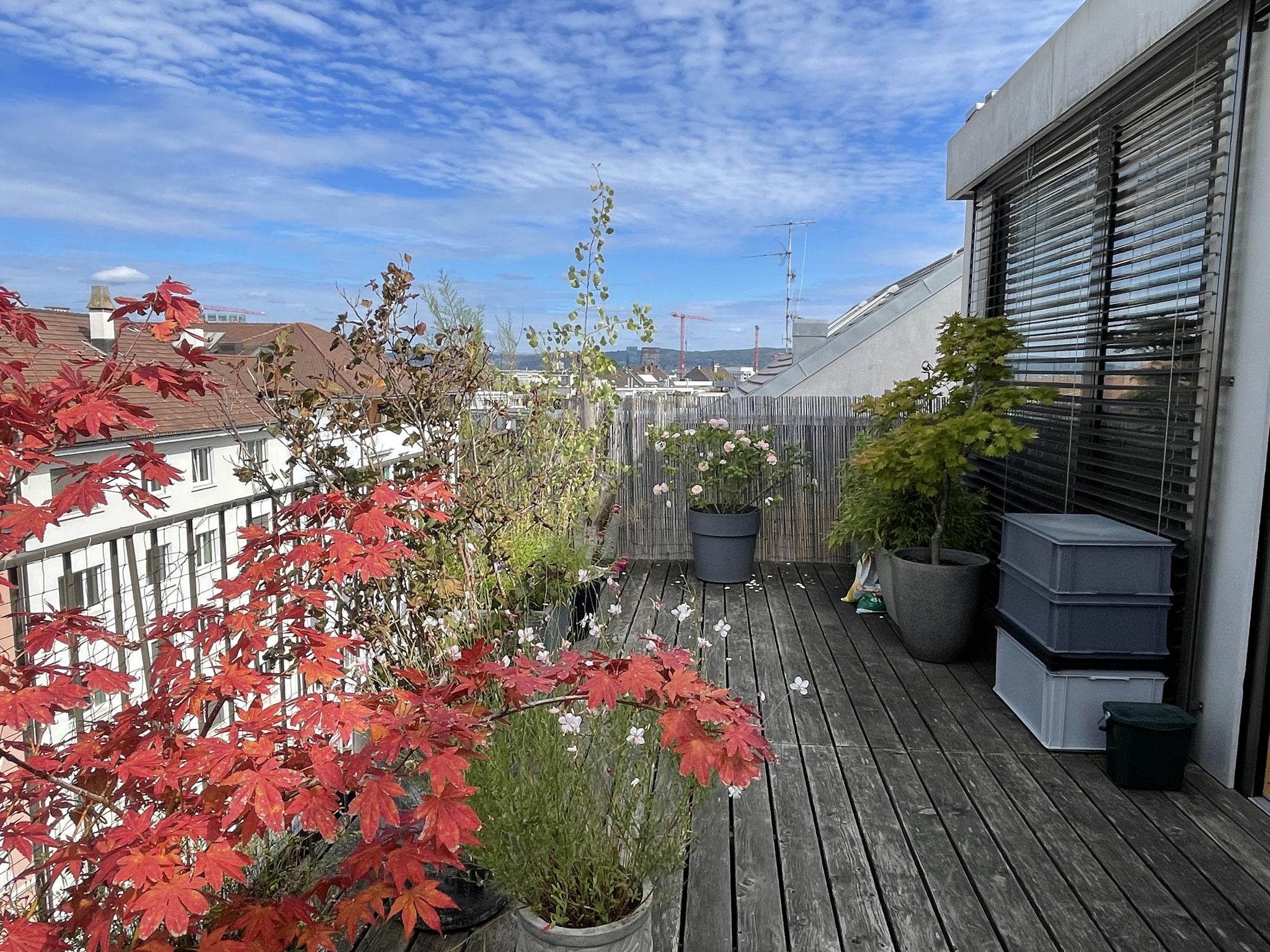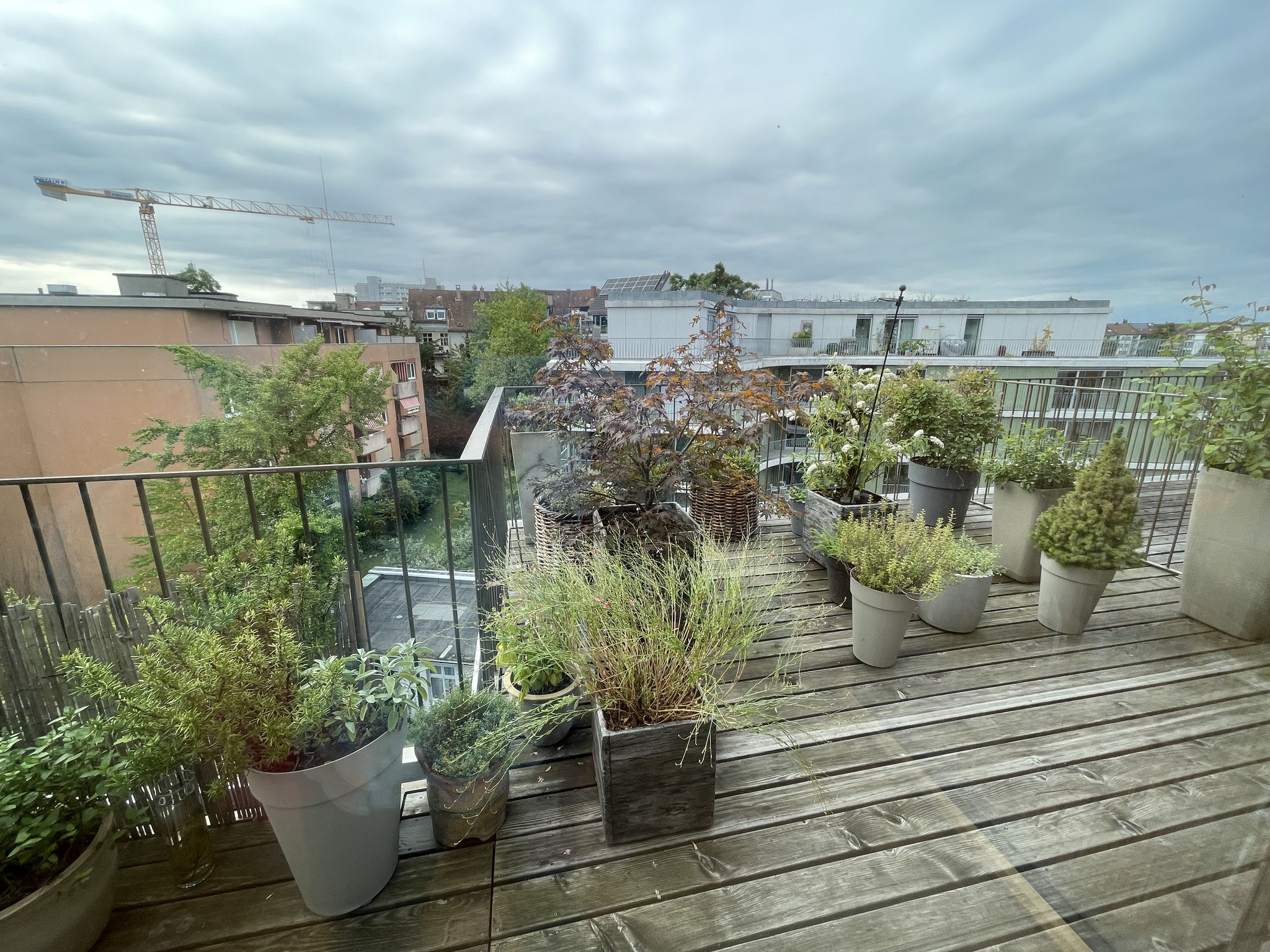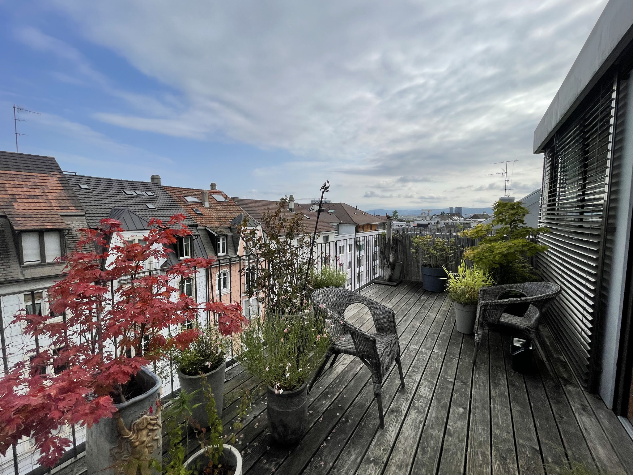 Vier Terrassen: Auf beiden Etagen je zwei Terrassen mit Holzboden (teilweise gedeckt) - ideal zum Entspannen, Gärtnern oder Geniessen der Aussicht über Basel.
