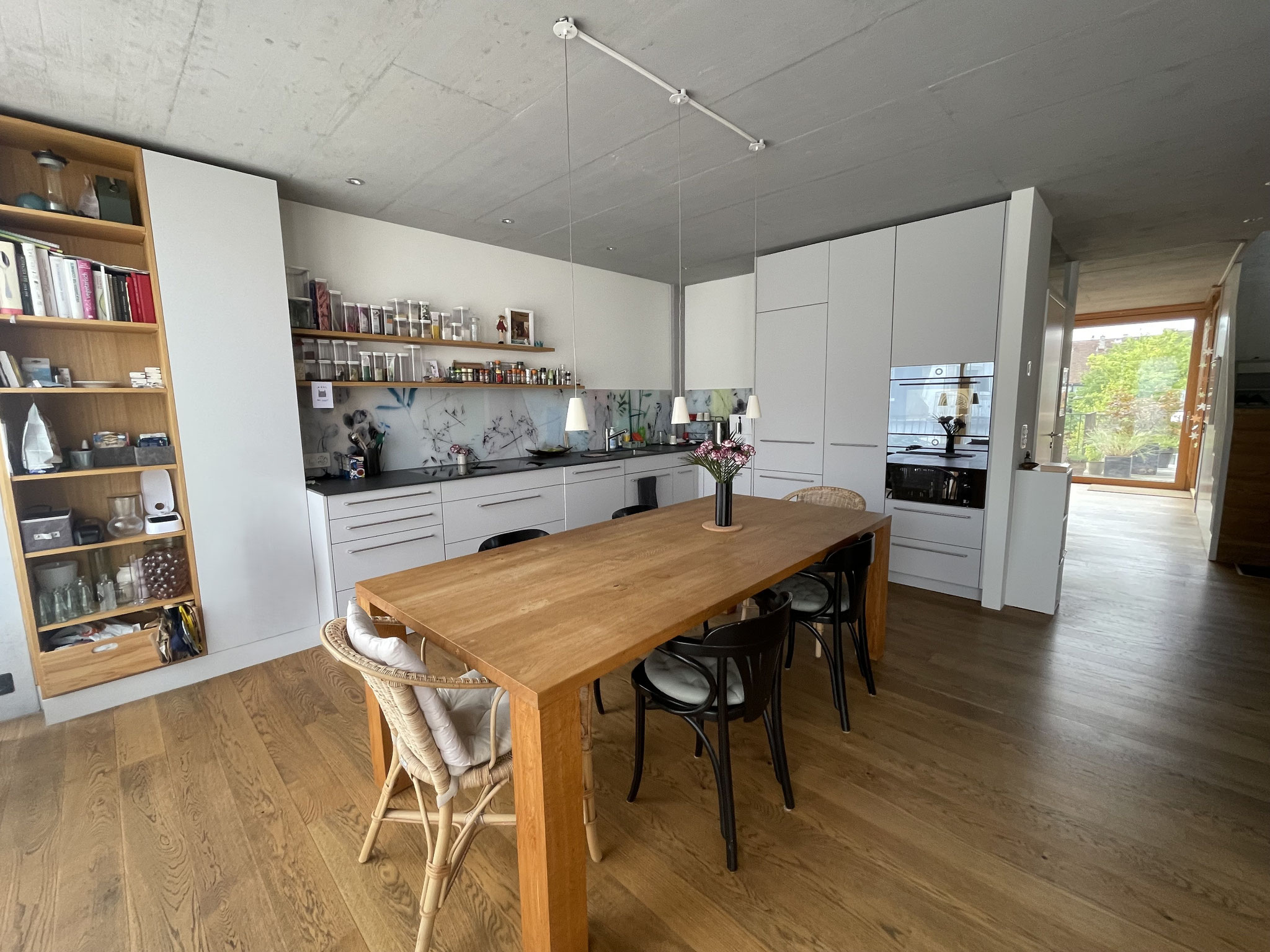 Lichtdurchflutetes Wohnen: Offener Wohn-/Essbereich mit moderner, hochwertiger Küche, edlem Holzboden, Sichtbeton-Decken und raumhohen Fenstern.