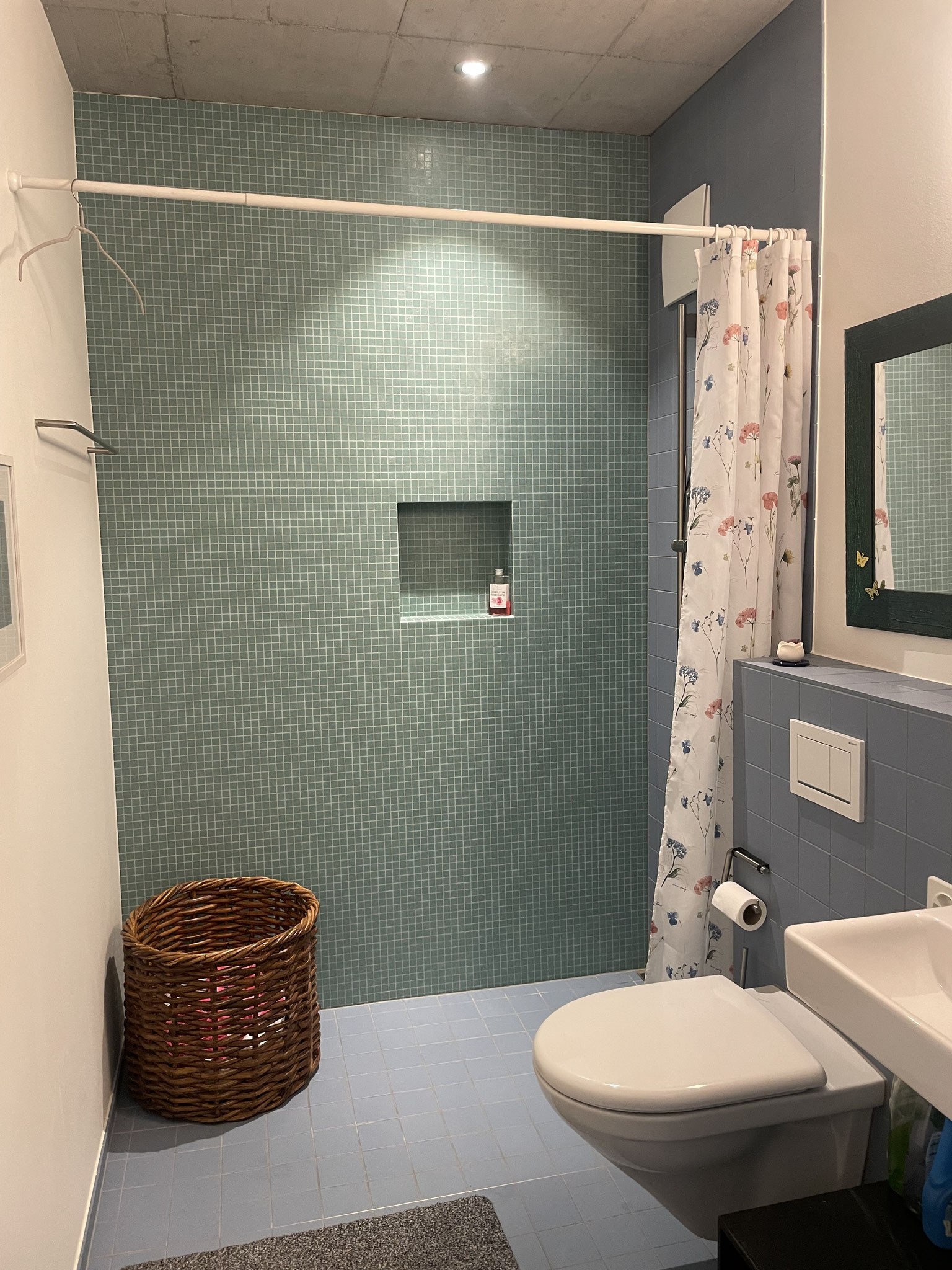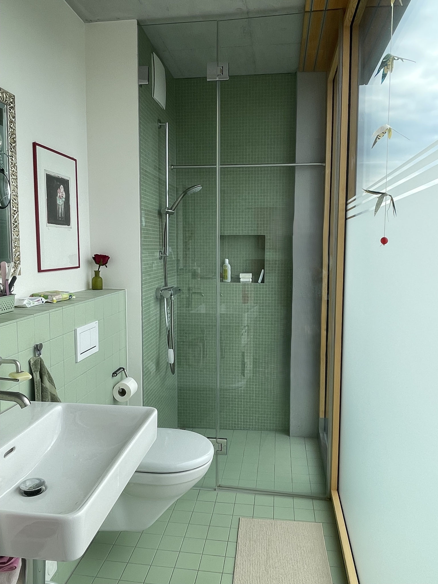 Zwei Badezimmer: Auf jeder Etage ein Bad - unten mit Dusche & Waschturm, oben mit Dusche und direktem Terrassenzugang.
